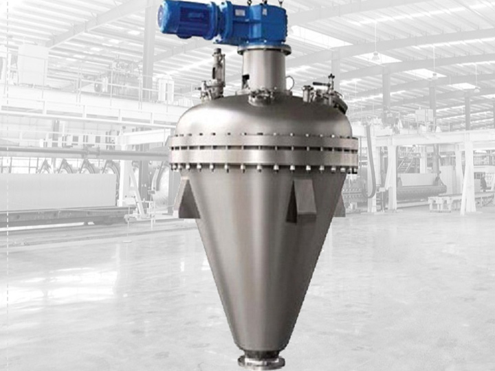 该设备是我厂消化和吸收国外同类产品而研制开发的新一代真空干燥混合设备;该设备主体立式静止,内部加热的螺带进行圆周搅拌提升运动,物料进入干燥腔体后利用夹套和搅拌螺带对物料接触加热,物料被螺带有序的搅动,翻转、提升、瀑落,使物料不断的与加热腔壁接触而进行强制热交换,受热挥发的溶媒在真空状态下被抽走,从而达到快速干燥的目的。